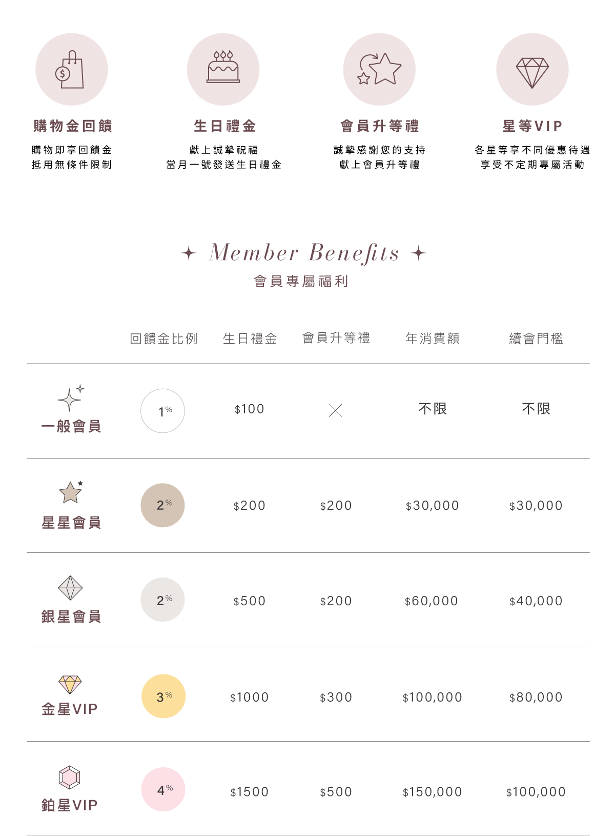 (不含客製商品、精品裸石、鑲嵌、維修等服務,特殊活動將不配合累積回饋金)