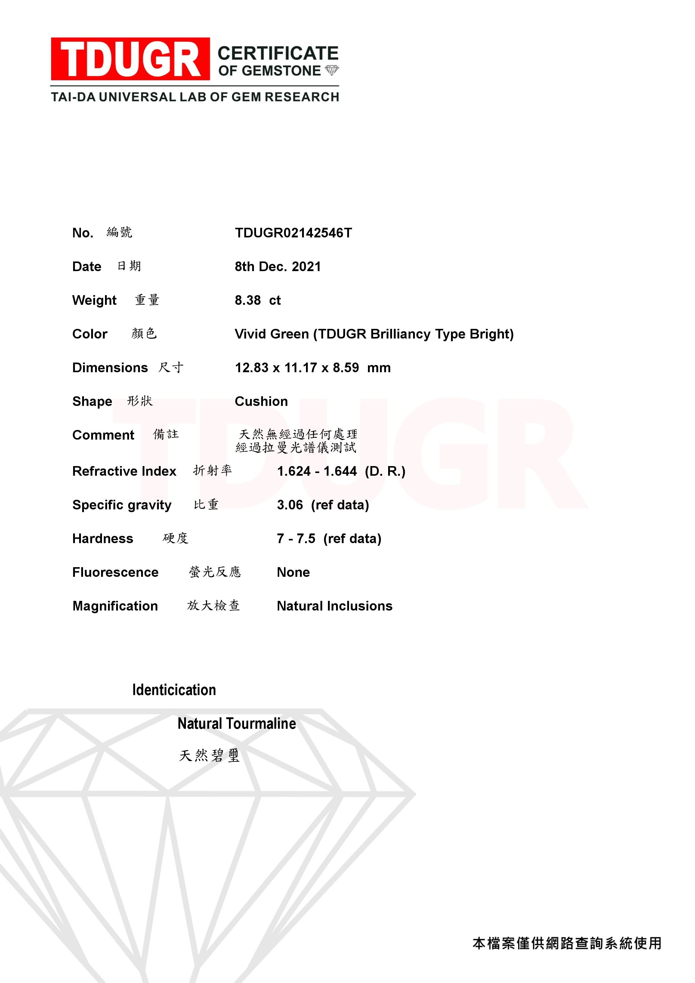 規格:綠碧璽8.38ct,鑽石共0.19ct
