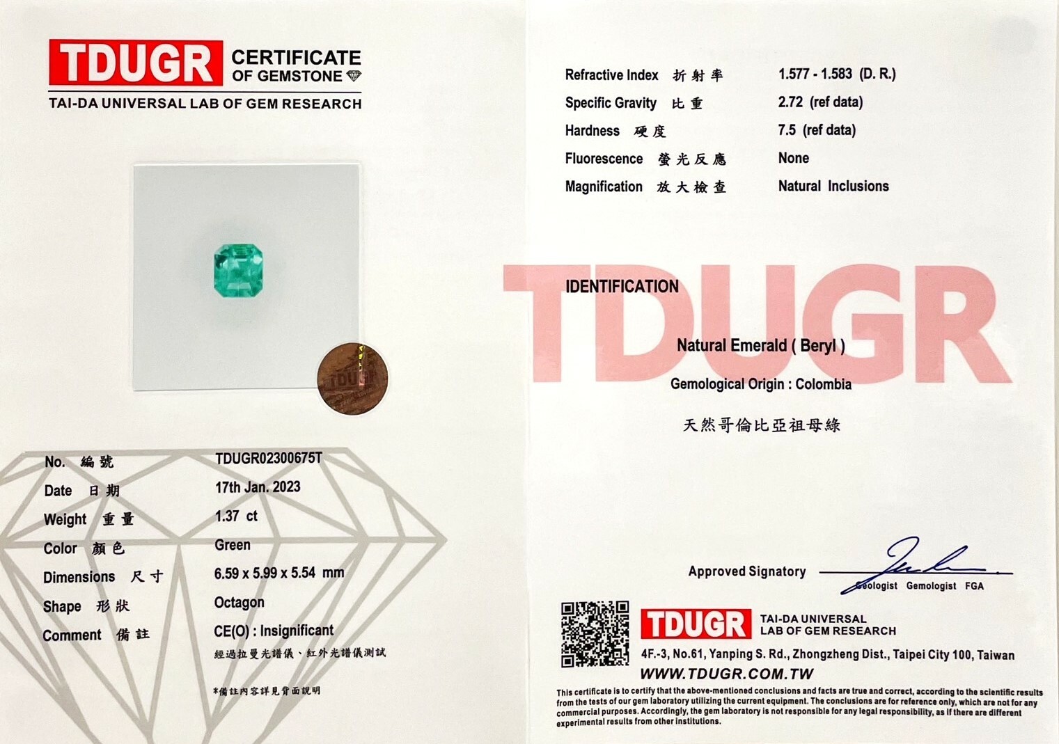 規格 : 祖母綠主石1.37ct;鑽石總共0.12ct
