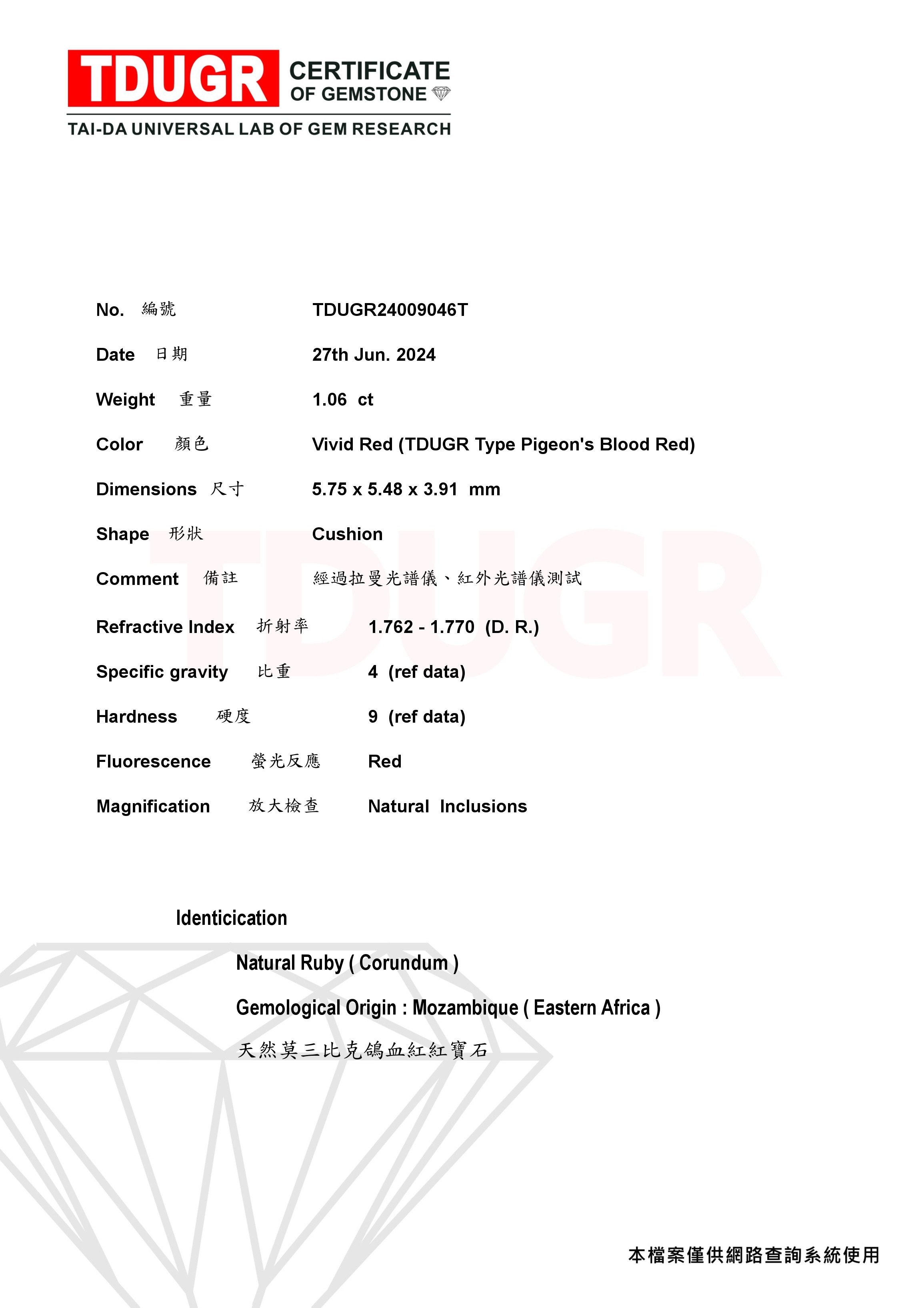 尺寸:紅寶石5.75x5.48x3.91mm,檯面造型約12.3x12.0mm,戒臂最寬處約1.7mm