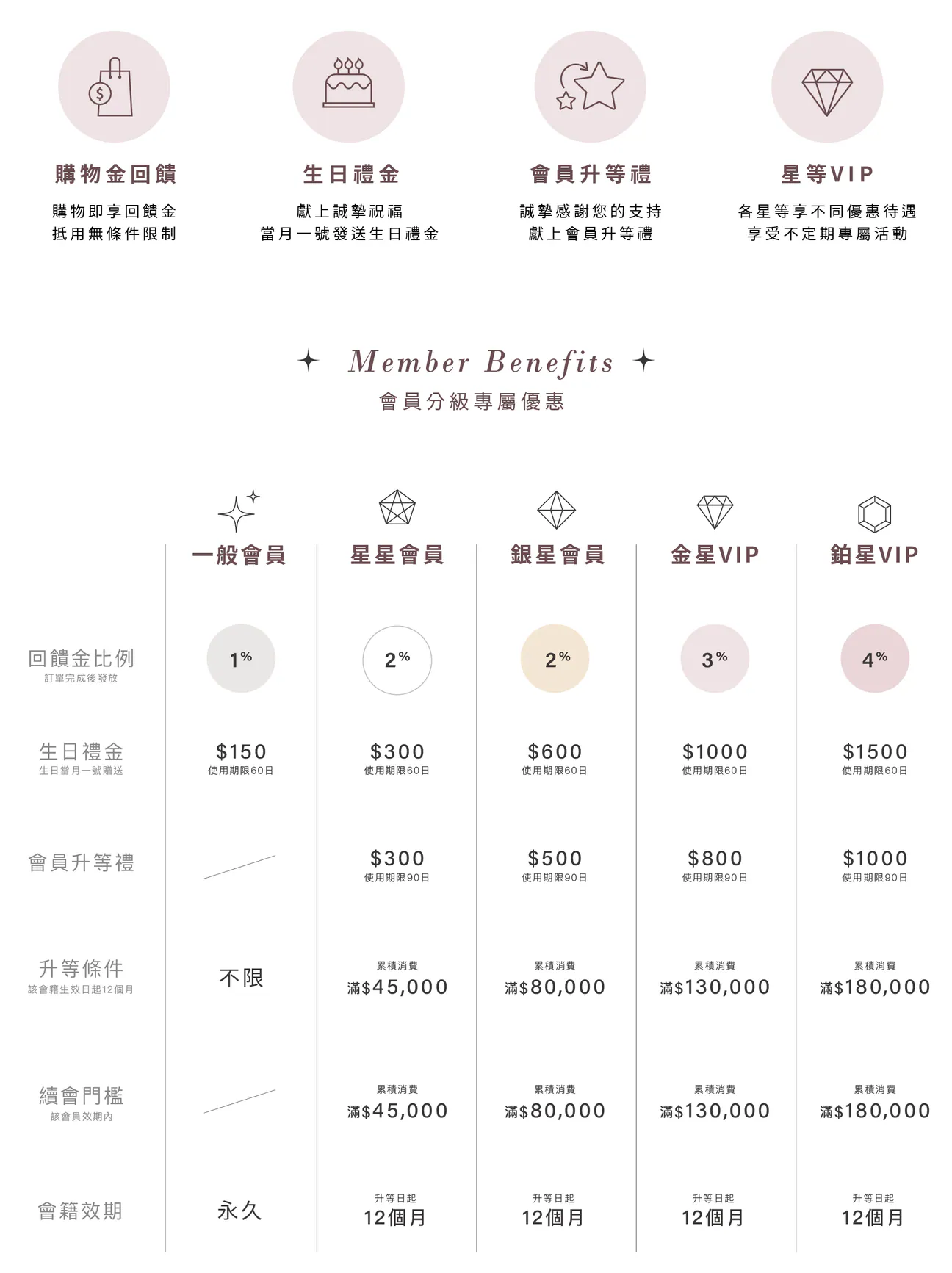 - 當顧客訂單完成付款後,系統將於隔日凌晨依照升級條件計算會員等級。會員升等禮使用期限為90日,請盡早使用。
