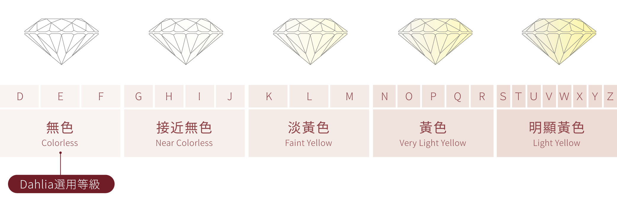 依據GIA的鑑定標準,鑑定師會將鑽石與比色石對比後,將鑽石依成色區分成D到Z不同等級,越接近無色的價格越高